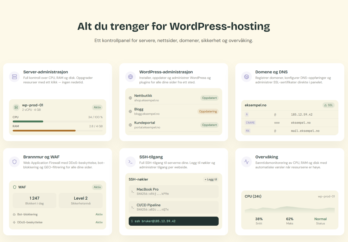 Ny identitet ble utviklet med utgangspunkt i akkurat det. Mørk grønn som reflekterer norsk natur og fornybar energi. En varm kremhvit som minner om sidene i en hyttebok. Overskrifter med karakter og personlighet – ikke klinisk sans-serif. Og mørk modus, fordi Deploi sine kunder er utviklere og byråfolk som lever i terminalen.